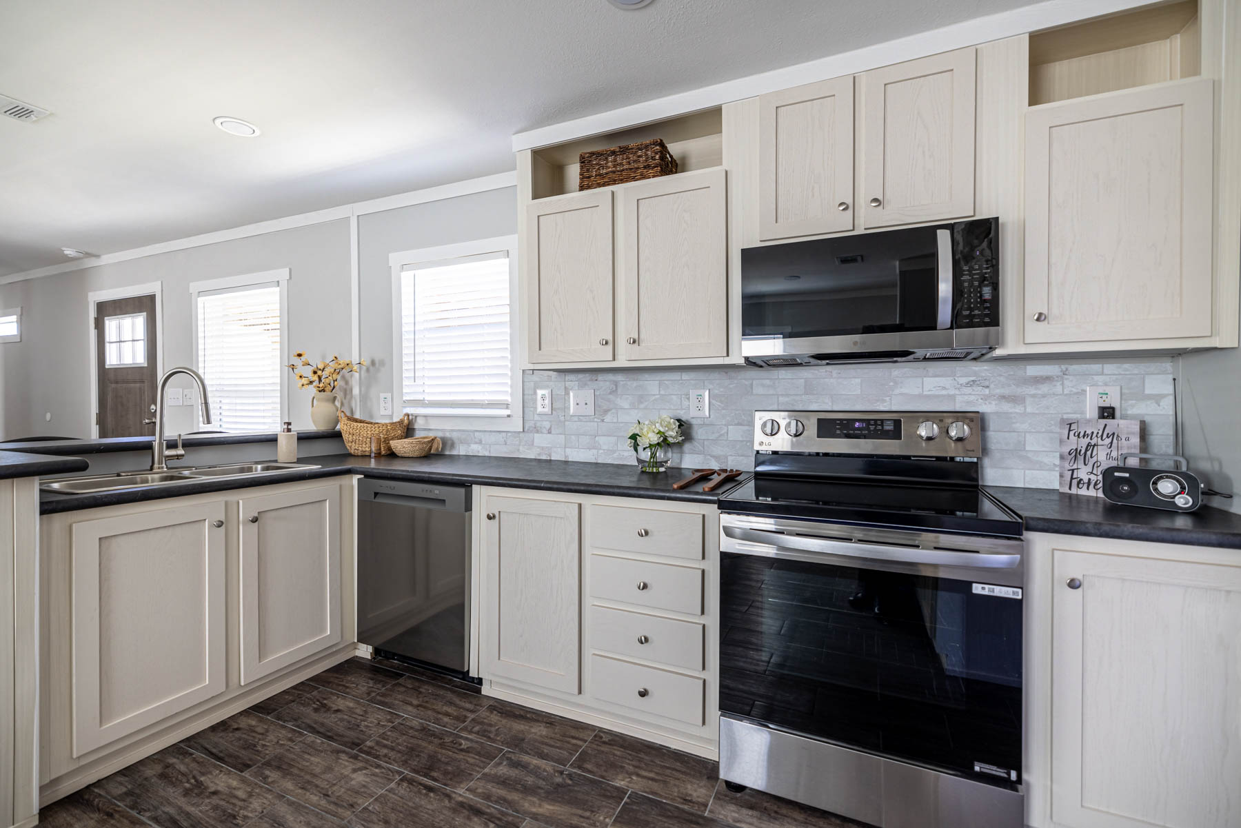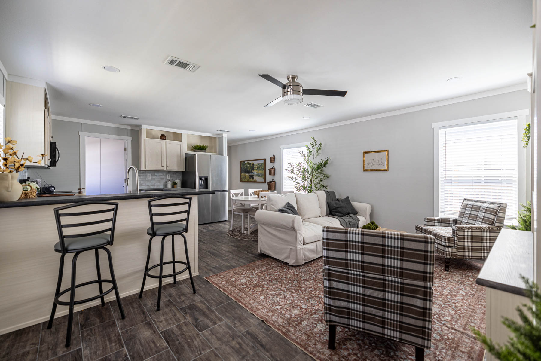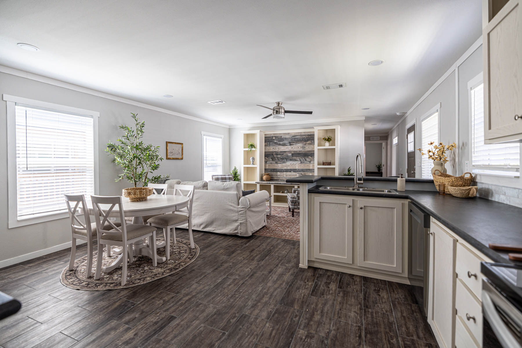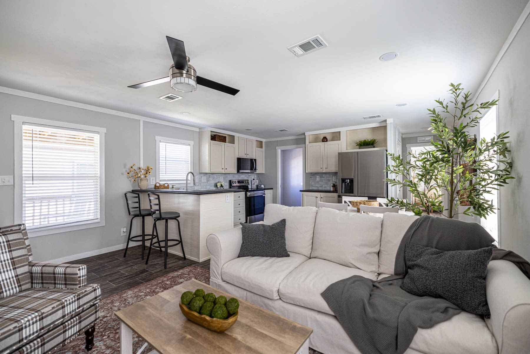 The 221 is a well-designed three-bedroom, two-bathroom home that brings together open living and modern style. The open-concept layout creates a seamless connection between the living area, kitchen, and dining space, offering a comfortable and functional environment for both everyday living and entertaining. At the center of the home, the kitchen features bar seating along with stainless steel appliances and an induction heating range, providing a clean, efficient, and inviting space for cooking and gathering. The layout flows naturally into the living area, where a built-in entertainment center adds both convenience and a focal point for the space. The thoughtful design ensures each area feels connected while still maintaining its own purpose, making the home feel balanced and easy to live in. On the exterior, a two-tone paint scheme adds visual interest and curb appeal, giving the home a distinctive and polished look. The 221 offers a blend of functionality, style, and comfort—making it a great option for a variety of lifestyles.