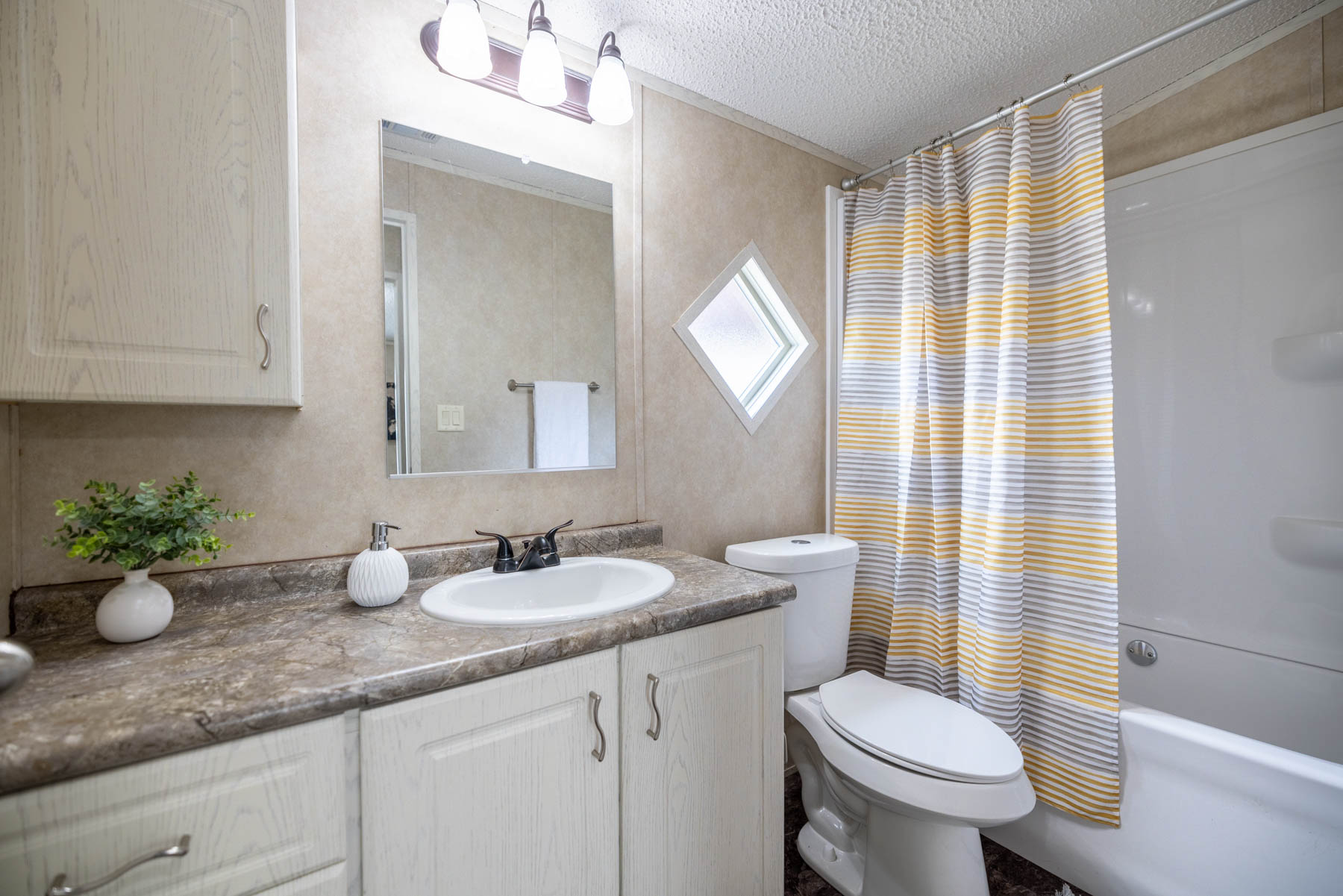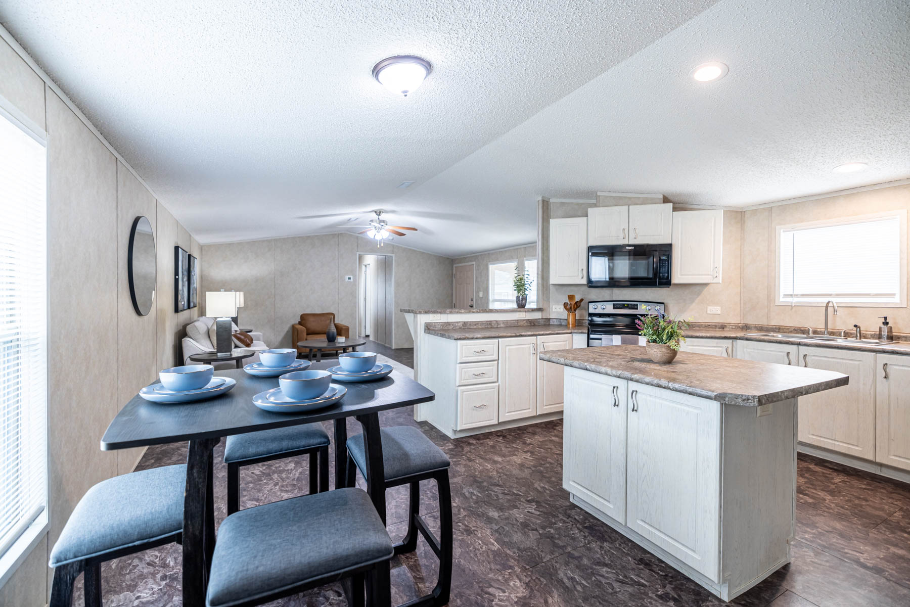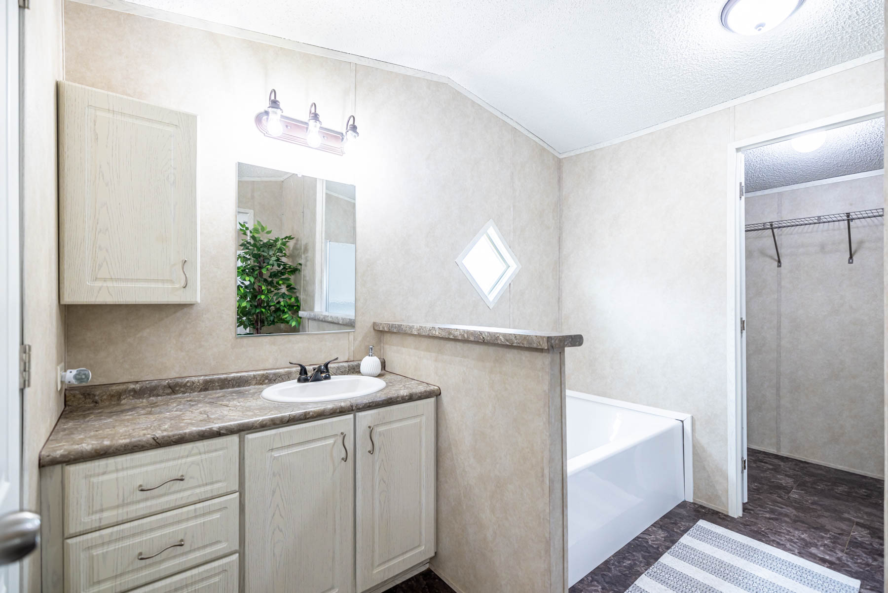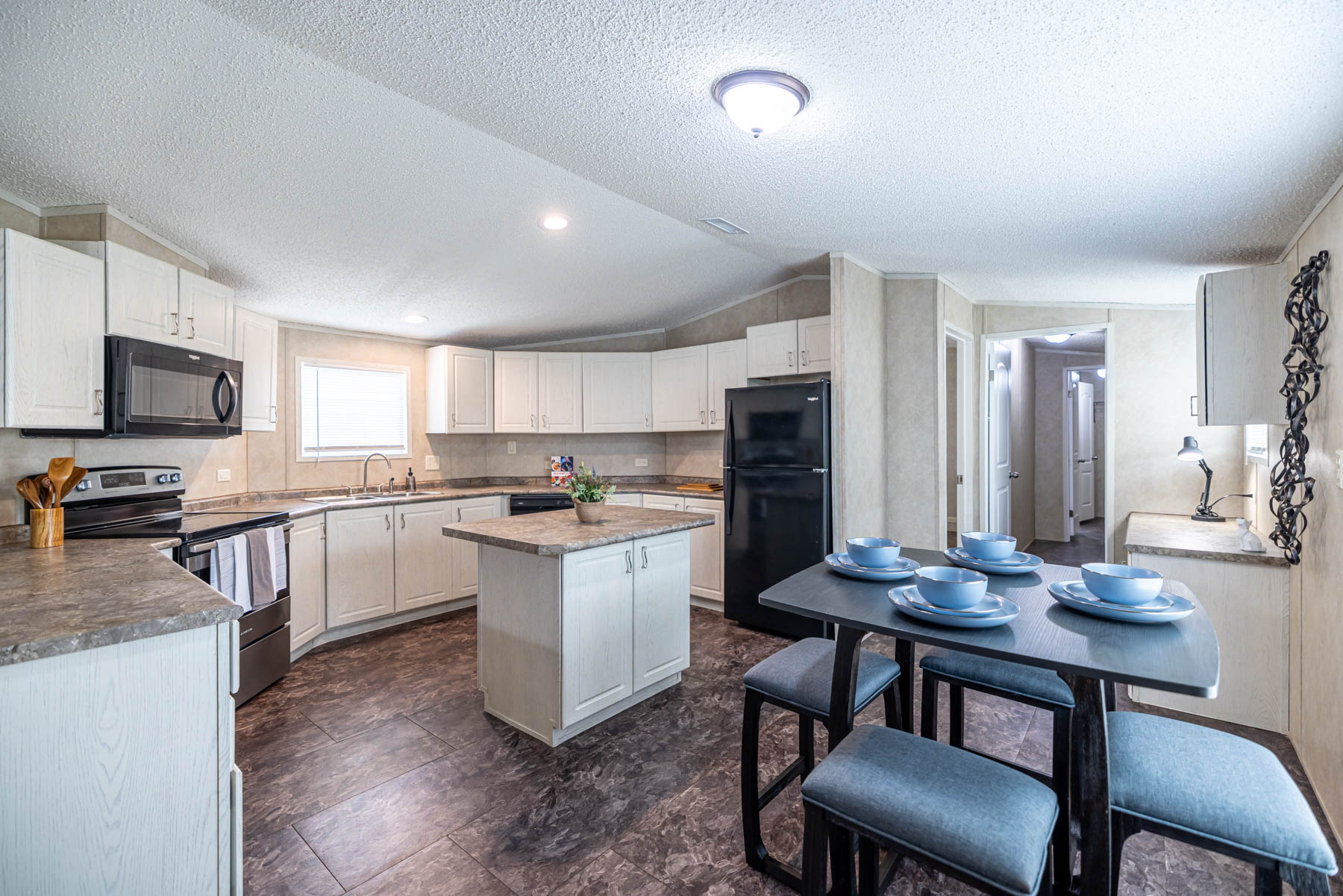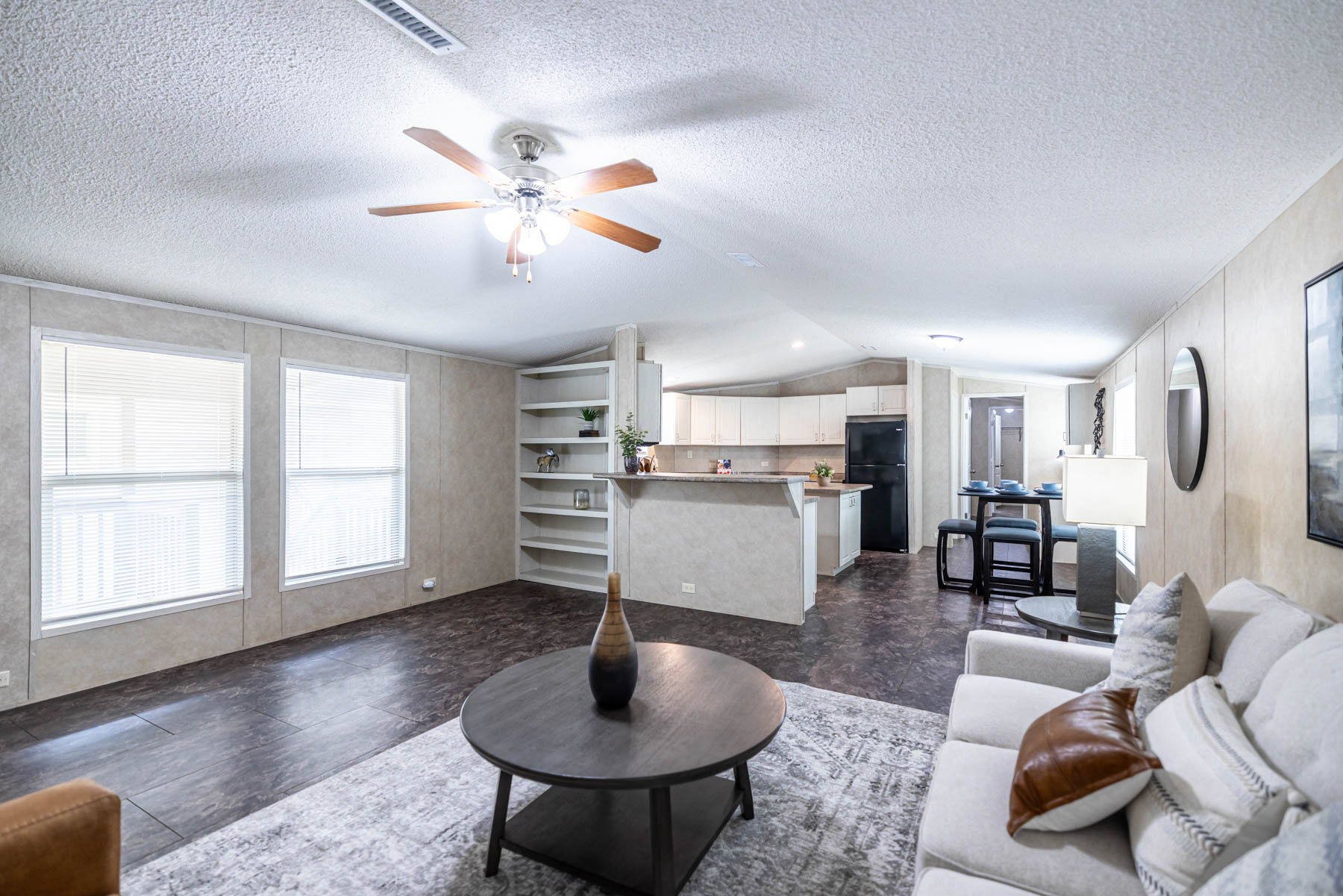 The H-1880-32E is a well-designed home that combines open living with practical, everyday functionality. Featuring three bedrooms and two bathrooms, this floor plan offers a comfortable layout that feels both spacious and easy to live in. The open-concept design seamlessly connects the kitchen, dining area, and living space, creating a natural flow for gathering and entertaining. A kitchen island paired with a large wrap-around counter provides ample workspace and seating, making it the true centerpiece of the home. Vaulted ceilings throughout enhance the sense of space, giving the interior an open and airy feel. The primary suite is designed for both comfort and convenience, featuring a walk-in closet and a well-appointed bathroom with dual vanities, a walk-in shower, and a separate bathtub. A dedicated utility room adds everyday practicality, while the separate dining area offers a defined space for meals or hosting. The H-1880-32E delivers a balance of openness, storage, and thoughtful design—making it a versatile home that fits a variety of lifestyles.